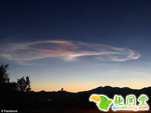 【环球网综合报道】据英国《每日邮报》3月27日报道,近日,一片出现在美国加利福尼亚州和亚利桑那州以及墨西哥北部的七彩祥云在社交网站上引起热议。有人赞叹这是大自然的鬼斧神工,有人惊呼这是火箭产生的迷幻烟雾,更有人脑洞大开,认为这是外星人留下的足迹。