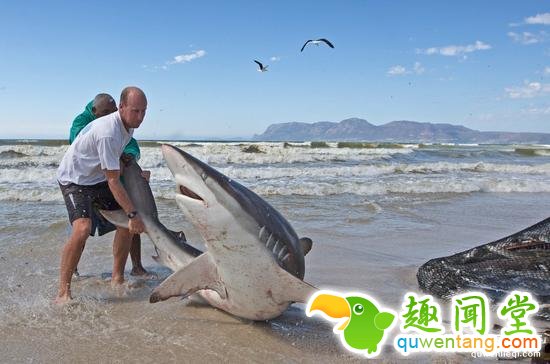 据英国《每日邮报》报道,近日,生活在南非开普敦海岸的一群渔民无意间用网捕到一条巨型鲨鱼,决定合力将它拖回海里放生。在这个过程中,面对巨鲨的血盆大口,这些勇敢而又善良的渔民表现得毫不畏惧,令人十分感动。
