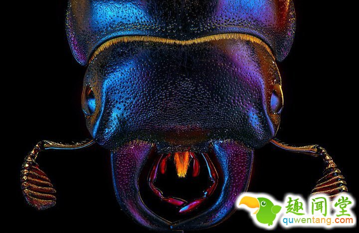 在显微拍照技术下,金龟属甲虫的全貌一览无余,外壳颜色非常斑斓,而且上面有着许多坑洼的小洞;它的嘴的造型也比较独特,给人非常有力量的感觉。