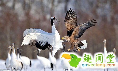 日本41岁的摄影师Ciming Mei 在北海道地区的雪地中拍到了这一精彩场面。当地刚下完雪,地面都被大雪覆盖,丹顶鹤常吃的灌木和鱼都在雪层之下。正当一群丹顶鹤准备进食时,一只老鹰飞了过来,想抢走丹顶鹤的嘴边食物。