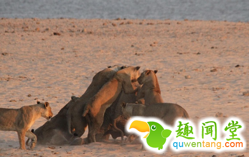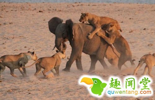 每日邮报报道,在赞比亚南卢安瓜国家公园内,一只8岁的小象面对14只饥饿的母狮感到束手无策,母狮们对它毫不怜悯,逮住落单的小象,轮流跳到它背上,磨牙搓掌。一支旅行队正好目睹并拍下了这持续了近3分钟的搏斗。