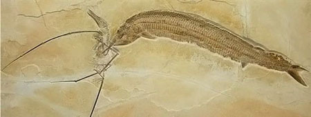 2009年,德国境内一块化石记录显示1.55亿年前具有戏剧性的一幕一只翼龙在热带泻湖上方飞行,突然发现水中一条类似鲱鱼的小鱼,并完成捕食,由于这一过程制造的动静过大,惊动了另一个掠食者剑鼻鱼(体长60厘米),剑鼻鱼从水中跃起,紧紧地咬住了翼龙左翼,最终3个动物都沉入水中。