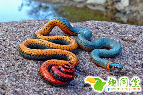 腹部上格外艳丽的橘色和红色,以及颈部的环形斑纹,让它看起来超毒,实际上却对人类基本无害。它的毒液毒性较弱,主要用来麻痹蜥蜴等小型猎物,但它最爱吃的其实是同类,比如黑头蛇和棱鳞哈氏蛇。